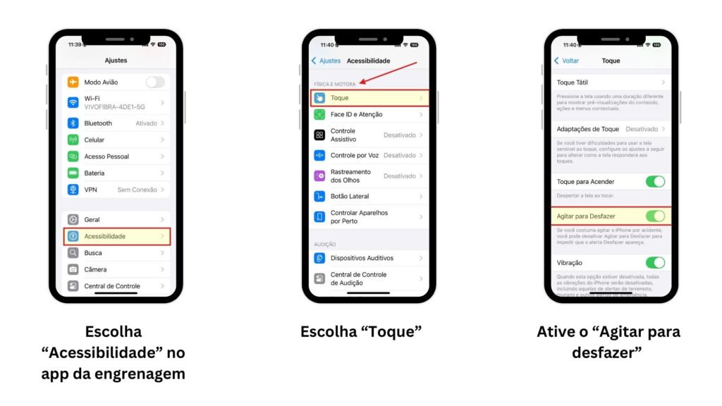 1. Acesse o app da engrenagem ⚙️ no iPhone ou iPad, escolha Acessibilidade, role até o título “FÍSICA E MOTORA” e escolha a primeira opção sob este título que é Toque. Role até a opção Agitar para Desfazer e ative. Resumindo: ⚙️ → Acessibilidade → Toque Agitar para Desfazer
